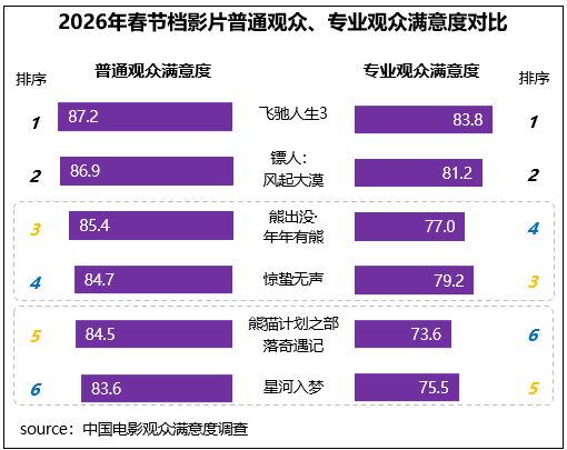 这两部影片满意度为近三年春节档影片的前三名,排名仅次于《哪吒之魔童闹海》(87.3分)。