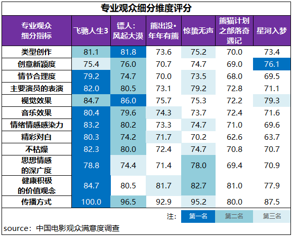 专业观众评价中,《飞驰人生3》获得了12项指标中的9项最高分评价,其中情绪情感感染力、健康积极的价值观念、不枯燥、主要演员表演得分都超过82分;《镖人:风起大漠》的类型创作、视觉效果居首位,其中视觉效果以86分创下了整个档期专业观众细分指标(不含传播方式)中的最高分;《星河入梦》的创意新颖度居首位。