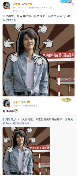 通过社交媒体,两人巧妙延续剧中人设进行隔空互动。例如,周澄奥以角色口吻发文称:“风里雨里,单宝昆在黑石礁站等你!”陈昊宇则化身温柔售票员庄好好,俏皮回应:“有月票嘛?”这种基于角色性格的对话,既呼应了剧中公交车相识的经典桥段,又让观众会心一笑,仿佛角色从荧幕走入现实。