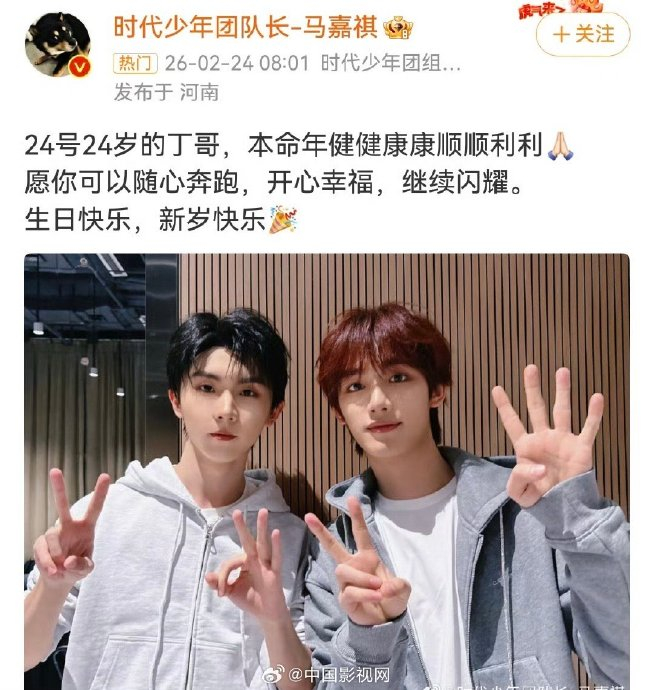 马嘉祺延续了与丁程鑫长达六年的手势庆生传统,在微博晒出两人合照:丁程鑫双手比出“24”手势,呼应本命年生日。文案中“健健康康顺顺利利”的祝愿,承载了从练习生时期延续至今的默契。严浩翔则巧妙结合二人旅行足迹,在新疆雪景中与丁程鑫共同用手势拼出“24”——去年共赴热带,今年同看雪原,温差旅程成为成长的见证。