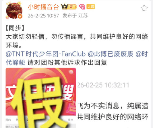 【#时代峰峻又火速辟谣了#】#时团成团生日无连线会成常态吗#近日,因丁程鑫生日直播没有队友连线,一个人直播吃蛋糕引发单飞热议。2月25日,时代峰峻官方回应粉丝称网传“时代少年团 单飞”为不实信息,纯属造谣,请大家切勿轻信。