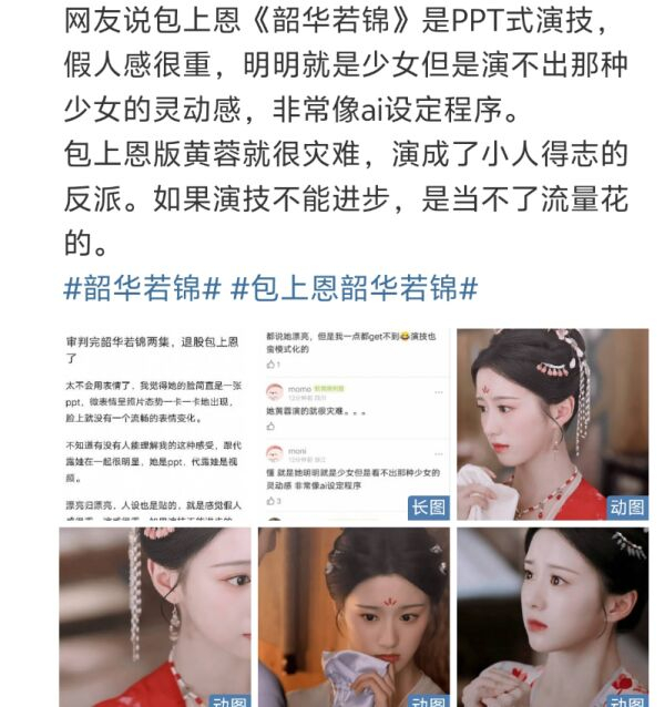 直到这次《韶华若锦》里,包上恩终于翻车了,有网友将她的演技形容为“机械式演技”,明明是美女,但她只是打扮得漂漂亮亮的,过分端着自己的仪态,每一个表情都很模式化,而且从来不做夸张的大表情,可能怕大表情会影响到颜值,被截到丑图。