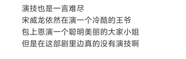 深入追剧后,很多网友的感受是:虽然男女主颜值高,但是不够灵动,很影响剧集的观感,宋威龙之前就被人吐槽像是没有香气的花,这一次,包上恩的表现同样让人出戏。