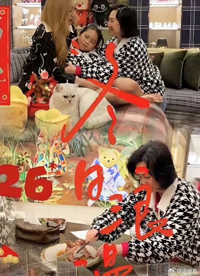 何超盈携6岁女儿辛阡觅(小名荷包蛋)专程邀请姐姐何超琼到自己位于香港山顶的五亿豪宅过年。三人身穿同款千鸟格外套,何超琼与外甥女更是搭配红色内搭,手持“百福图”合影,年味十足。何超琼全程抱着外甥女不撒手,时而举福字拍照,时而一起撸猫,互动自然亲密,宛如亲生母女。何超盈则在一旁温柔注视,配文“和家姐松弛过年”,流露出对姐姐深厚的情感依赖。