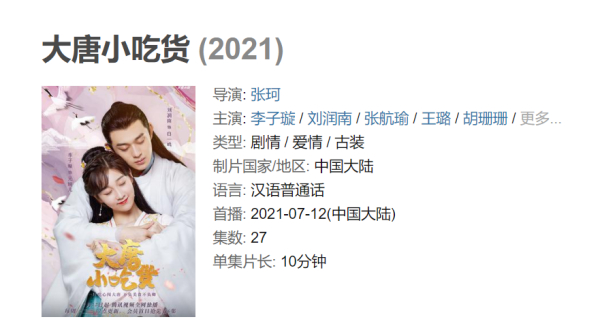 《大唐小吃货》是由腾讯视频、腾讯微视等出品,张珂执导,李子璇、刘润南、张航瑜、王璐等主演的一部美食甜宠微短剧。该剧于2021年7月12日在腾讯视频全网独播,共计27集。