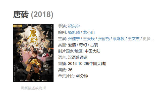 《唐砖》是由爱奇艺、乐合影业出品,陈嘉上担任总监制,祝东宁、秦鹏飞、齐建勇联合执导,张佳宁、王天辰、张智尧、袁咏仪等主演的穿越武侠轻喜剧。该剧于2018年10月29日在爱奇艺首播,共计37集。
