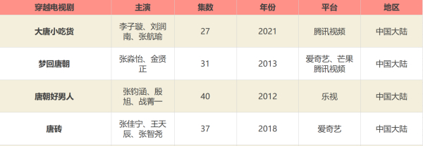 老规矩,有关于这四部穿越到唐朝的电视剧的具体年份以及播放平台等内容都已经放到下面表格当中了,各位友子们可以按需观看。当然,如果还想进一步了解每部剧的内容,也可以继续看下去哦!