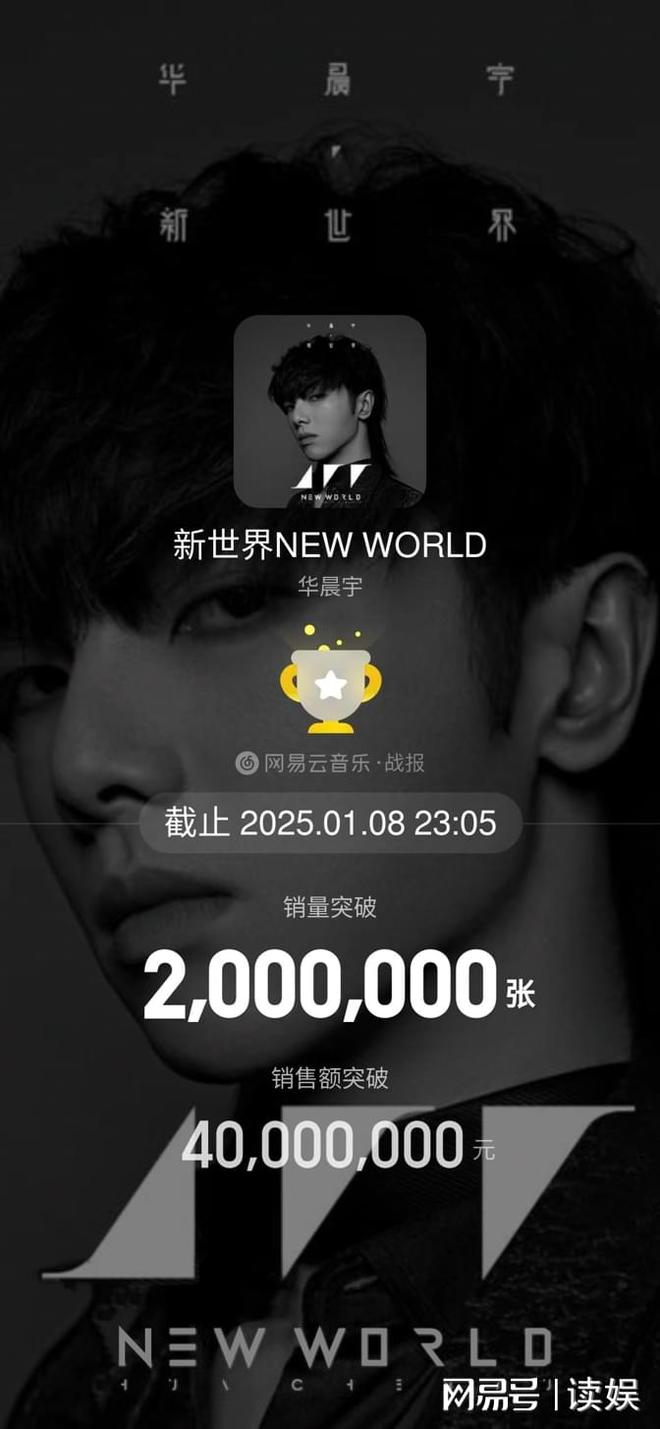 2025年1月8日,华晨宇第四张数字专辑《新世界NEW WORLD》销量突破200万张,再次刷新网易云音乐数字专辑的最高销量纪录,销售额突破4000万元。此前,《新世界NEW WORLD》(数字版)曾获2019-2020年度网易云音乐原创盛典“年度最畅销数字专辑”荣誉,专辑预售开启24小时后,销量便突破89万张。目前,华晨宇第六张数字专辑《量变临界点》正在预约中,将于1月10日14:07正式上线发售。