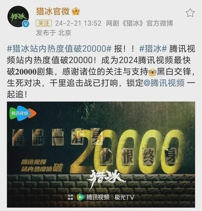 电视剧《猎冰》成为腾讯视频站内最快热度过20000的剧集!