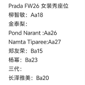 2026年2月26日,Prada秋冬大秀现场座位表曝光后,杨幂的座位(Ba23)与韩国艺人柳智敏(Aa18)的位置差异引发热议。部分网友指出柳智敏位于T台入口侧的Aa区首排,而杨幂作为品牌代言人却被安排在模特出场视角右侧的Ba区第二排,质疑品牌存在"厚此薄彼"的倾向。更有人将此次安排与此前杨幂在微博之夜的风波关联,暗示其业内地位下滑。