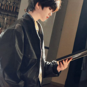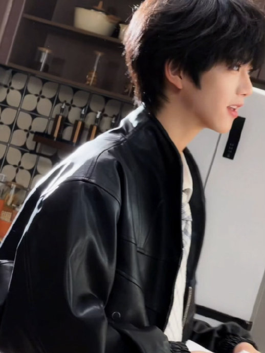张函瑞身穿黑色皮衣,通过光影对比强化面部轮廓,营造出冷峻气质。粉丝高频使用“酷帅小黑猫”形容其反差魅力,既凸显皮衣的硬朗感,又保留其特有的灵动少年感。