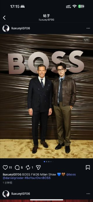 刘学义作为BOSS品牌受邀嘉宾亮相2026年2月27日米兰时装周秀场,期间与品牌CEO Daniel Griede、足球巨星大卫·贝克汉姆共同合影。