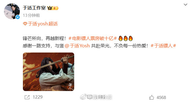 电影官微及于适工作室同步发布票房破10亿海报,强调"江湖浩大,前路可期";