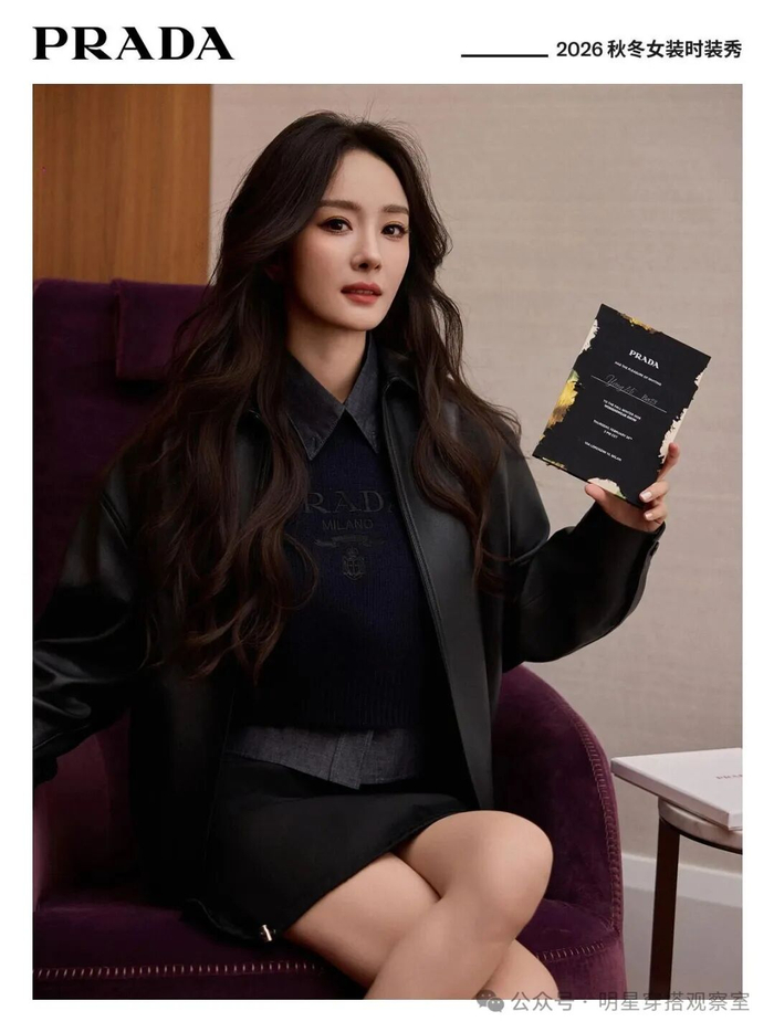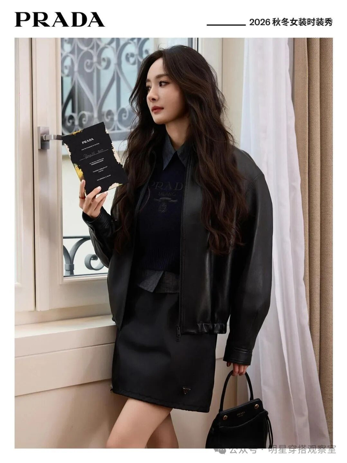 杨幂:黑色皮质套装,Prada秀场酷飒感拉满