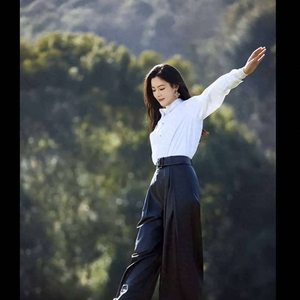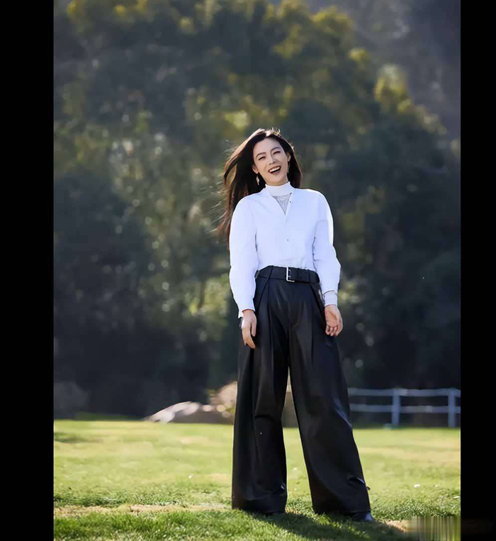 照片中的她倚着大树,白衬衫配黑皮裤,显得既利落又随性,气氛轻松自如,仿佛时间缓慢流淌。她站在溪边,微风吹拂,长发飞扬,白衬衫在阳光下显得格外清新,举手投足间尽显从容与优雅。她抬起手臂,迈开步伐,笑容灿烂,活力满满,似乎没有什么可以阻挡她的自由和欢愉。