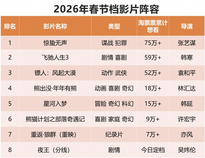 2026年春节档电影的宣传策略围绕差异化定位、影旅联动、情怀反差和价格补贴等多维度展开。今年春节档长达9天,汇聚了《飞驰人生3》《惊蛰无声》《熊出没·年年有熊》等8部类型各异的影片,预售票房已突破2亿元,但未出现绝对领跑者,使得精准宣传成为决胜关键。