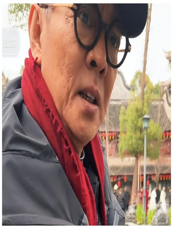 视频里他戴着帽子,露出两鬓,两鬓头发都白了,脸上坑坑洼洼的皱纹也很明显,就是普通小老头的模样,