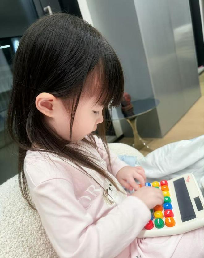 照片中,小蛋饺在自己家中玩耍,她坐在沙发上玩着母亲给她买的玩具,小姑娘坐在沙发上目不转睛地玩着好认真,母亲拍照完全没被影响。