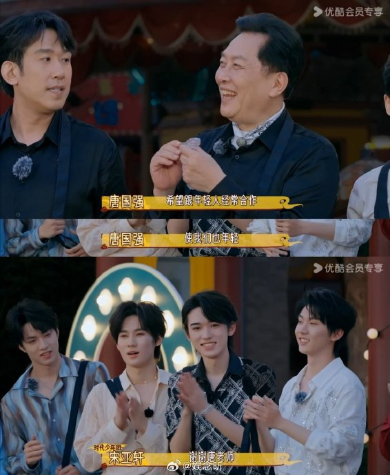2026年2月,唐国强在《主咖和Ta的朋友们》中与时代少年团同台时,多次说错成员名字(如将丁程鑫误称“工程鑫”),却直言“一有机会就合作”。脱口秀演员呼兰当场调侃其“认不清是装的,回家复盘生怕认对”,唐国强坦然自嘲的态度强化了喜剧效果,被网友评价“不是他的圈子他硬挤”。这一“记流量不记名字”的反差梗迅速发酵,衍生出“痛包、吧唧、饭撒(粉丝应援术语)学大师”等网络标签。