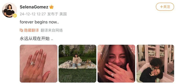 据悉,两人于2023年12月官宣恋情。去年12月12日,赛琳娜在个人社交账号发文宣布自己和男友订婚,并晒出订婚戒指。