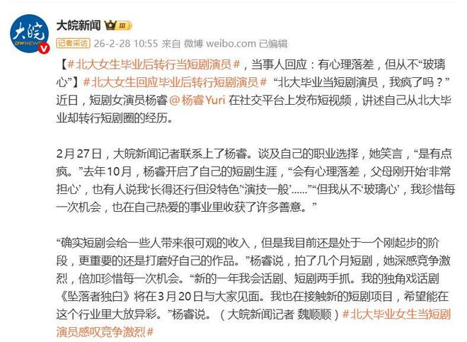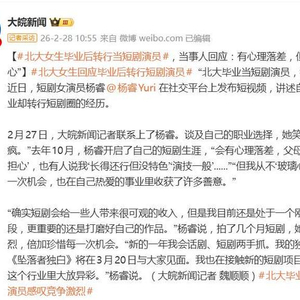 “北大毕业去拍短剧,我是不是疯了?”,据2月28日报道,短剧女演员杨睿在网上的自白,让“名校生就业选择”这个话题又一次被推上风口浪尖。一位北大毕业的文科状元,没有走进体制内或光鲜的写字楼,反而扎进了竞争激烈的短剧片场,这波操作让不少网友直呼“看不懂”。