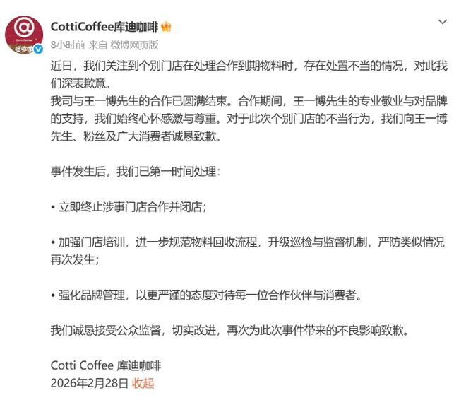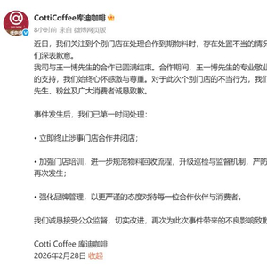 2月28日,针对有门店销毁前代言人王一博合作物料引发的争议,连锁咖啡品牌库迪咖啡发布致歉声明称,公司与王一博的合作已圆满结束。对于此次个别门店的不当行为,库迪咖啡向王一博、粉丝及广大消费者诚恳致歉。
