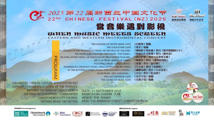 本场演出由新西兰新中文化交流协会出品、大唐乐府演奏。感谢中国驻克赖斯特彻奇总领馆、新西兰民族社区部、基督城市政府、独家冠名赞助商NEW TRAVEL、战略合作伙伴iBesDina、Ethnic Communities Development Fund、Rata Foundation、Aotearoa Gaming Trust、Mainland Foundation、COGS、Strengthening Communities Fund, 以及南岛地区的华文媒体牧羊人影业、境界摄影工作室、格调基督城、信报、亚洲桥、华人头条南岛、华新时报等给予的大力支持和资助!