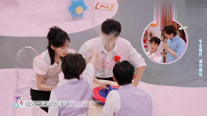 游戏第一局孙千就紧急撤回一杯水,水泼到一半发现错了,撤回洒到了自己身上。