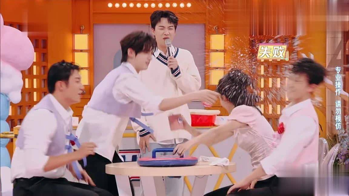 丁程鑫不仅泼水速度快,挡水也是很有水平,宁愿自己被水泼到,也不让黄景瑜被泼到。
