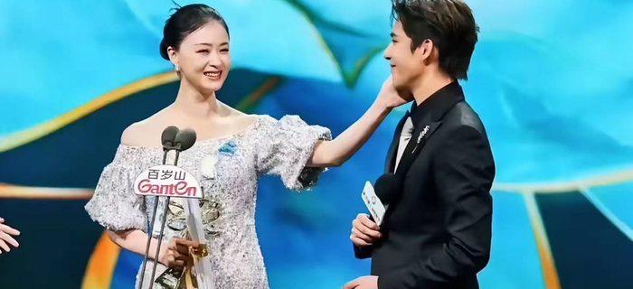 特别是在蒋欣上台领奖时,王安宇作为“儿子”,立刻就开起了玩笑,贴脸喊出了蒋欣的经典台词:“蒋欣在哪里?”接着迅速补充:“掌声就在那里!”而当蒋欣下台时,他又大声说:“姐,妈,先别走,送你一篮蛇瓜,希望以后作品像蛇瓜一样高质又高产!”这些幽默风趣的言辞,让蒋欣忍不住笑着摸了摸他的脸,气氛轻松又自然。