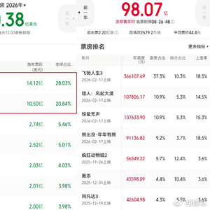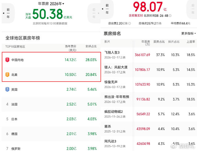 截至3月1日8点,2026年中国电影票房突破98亿元,超过同期北美电影市场,暂居全球单一市场票房第一。这组数据自带强烈的反差:一方面,春节档同比大跌37.62亿元、跌幅接近40%,回到2018年同期的水平;另一方面,即使是这样,今年1-2月的中国影市依然是全球冠军。