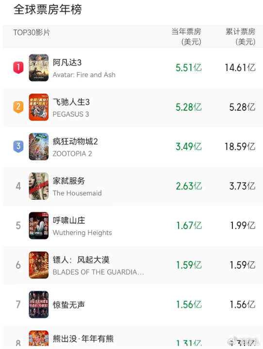 同期北美市场的表现更为惨淡。2026年开年至今,北美周末票房多次创下年度新低,第08周单周大盘仅6170万美元,环比暴跌42%,头部影片票房普遍腰斩。好莱坞依赖的IP续集、超级英雄、视效大片集体失灵,即使是《阿凡达:火与烬》也不能拉动大盘回暖。