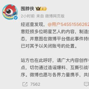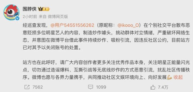 2月28日晚,@围脖侠发文表示@用户54551556262(原昵称:@ikooo_O)在个别社交平台散布恶意贬损多位明星艺人的内容,制造炒作噱头,挑动群体对立情绪,严重破坏网络生态,并意图在微博平台借此事件持续炒作、吸粉引流,因违反社区公约,目前站方已对其予以关闭账号的处置。