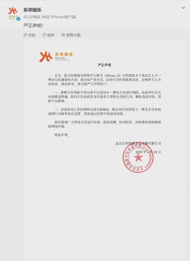 此后,@乐华娱乐 发布声明:该账号不实内容不仅是对王一博先生的设计构陷,也是对社会公众的蓄意欺骗,我们正告造谣者及传谣者立即停止侵权行为、删除造谣内容、消除不良影响。