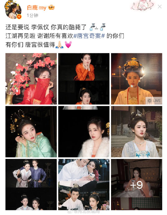 2026年3月1日剧集收官当日,白鹿发布微博,以“江湖再见”致谢观众,强调“李佩仪酷毙了”,并称“有你们的喜爱,唐宫很值得”。同时,她晒出36张角色剧照回顾李佩仪的成长轨迹,从初入宫廷到沉冤得雪,完整呈现人物弧光。