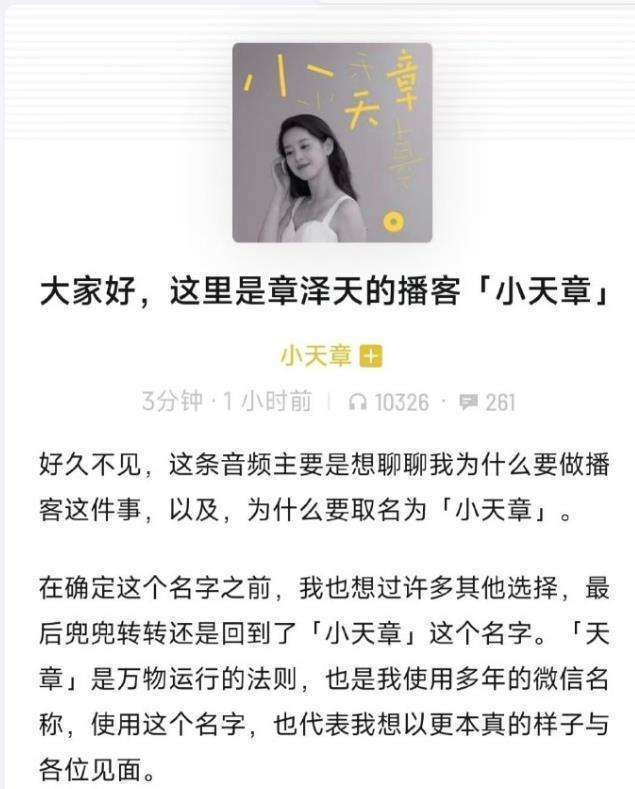 她继续说道:无论是在经验上,还是看待问题的视角,或是学到的技能上,我都在不断进步。虽然我公开表达的机会不多,但我从未停止过思考与好奇。对于章泽天来说,声音是最直接与他人沟通的方式,这也是她决定开启《小天章》播客节目的原因之一。