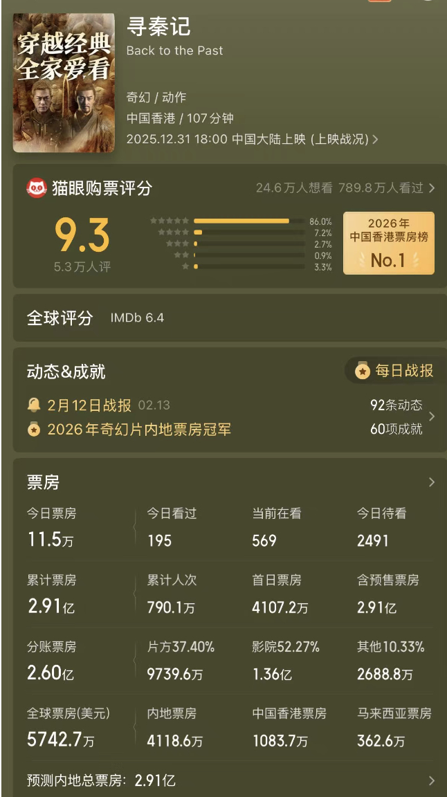 截止到今天,电影《寻秦记》都已经上映了一个半月了,目前内地的总票房是2.91亿,基本上再也没有增长的空间了。