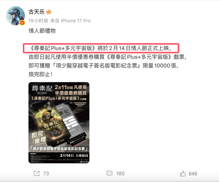 配合春节档的热度,古天乐还计划在23号的时候,全平台网播《寻秦记》。