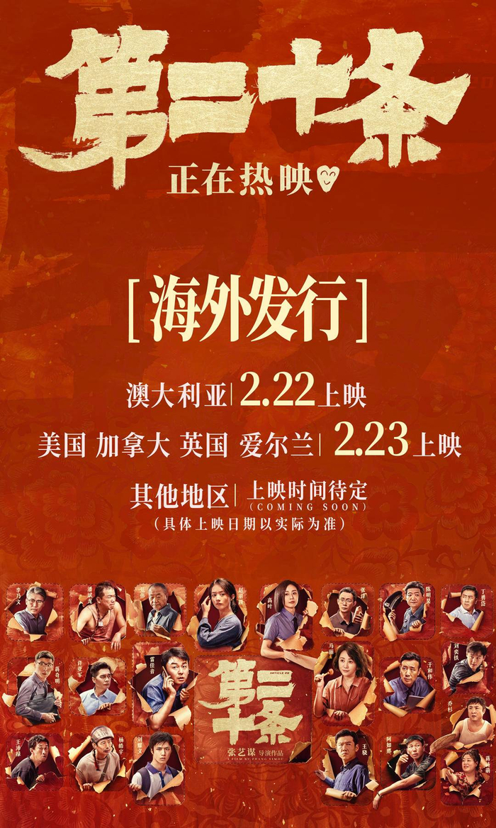 由张艺谋执导的电影《第二十条》,2月21日宣布将于当月22日在澳大利亚上映,2月23日在美国、加拿大、英国、爱尔兰上映。据悉,其他国家和地区的上映时间也将陆续公布。