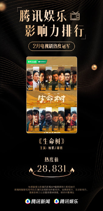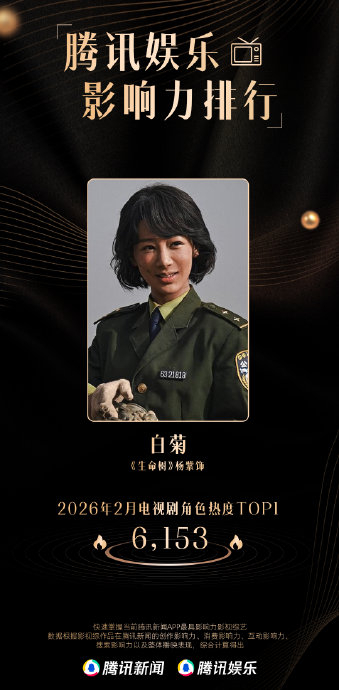2026年3月1日腾讯娱乐影响力排行榜公布2月榜单,电视剧《生命树》以综合热度值28,831斩获"电视剧热度冠军",杨紫饰演的巡山女警"白菊"同步以角色热度值6,153登顶"电视剧角色热度TOP1",实现剧集与角色双项冠军。酷云数据同期确认"白菊"蝉联2月角色热度月榜冠军,延续开播以来的强势表现。