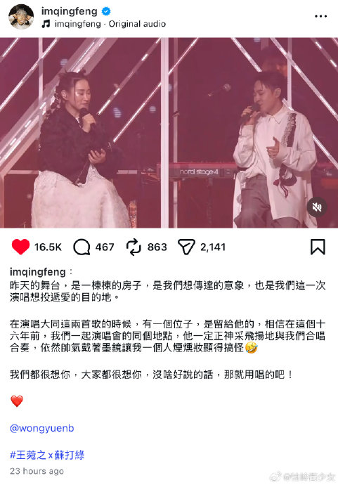 王菀之的哽咽,最终被转化为一种温柔的力量。她与青峰在感伤后以《Love, Lotus》延续对纯净情感的追索,并在《你被写在我的歌里》的合唱中,将个体思念升华为对友情永恒的坚信。那句带着泪的笑言“不要唱错,不然下次又要等十六年”,以举重若轻的方式,承诺了记忆的延续。音乐在此刻成为最坚韧的纽带,串联起过去、现在与未来,让缺席者以旋律的形式永生。