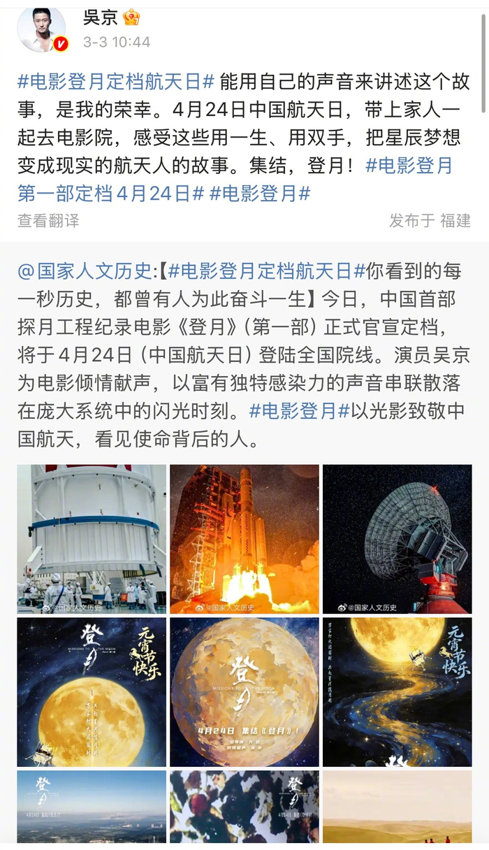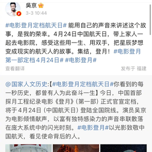 #纪录电影登月官宣定档#【#吴京献声纪录电影登月#】今天,中国首部聚焦探月工程嫦娥六号任务幕后航天工作者群像的纪录电影《登月》(第一部),官宣定档4月24日中国航天日全国上映。@扬子晚报 记者了解到,演员吴京为该片配了旁白。