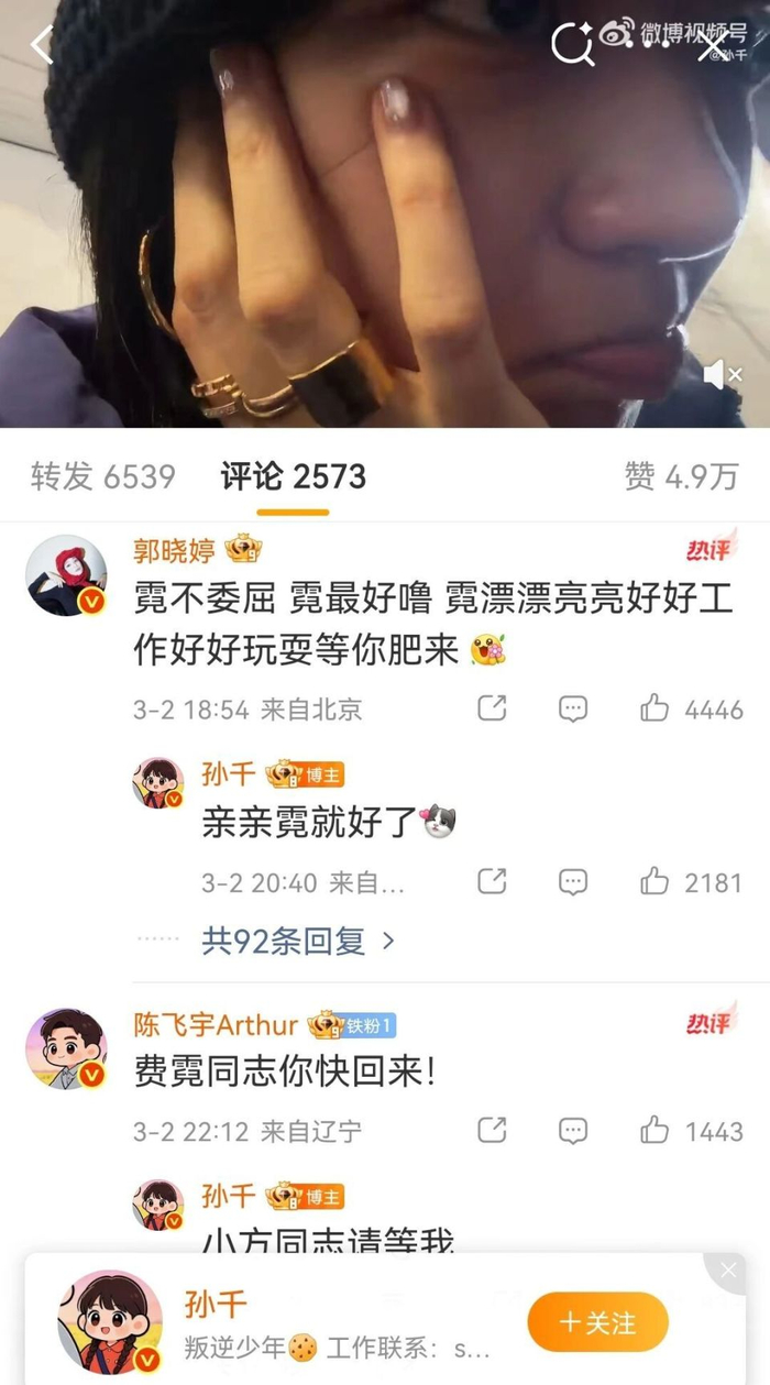 郭晓婷先是在孙千的道歉微博下面留言,没用客套话,直接用剧中角色昵称“霓”称呼她,写道“霓不委屈 霓最好噜 霓漂漂亮亮好好工作好好玩耍等你肥来”。