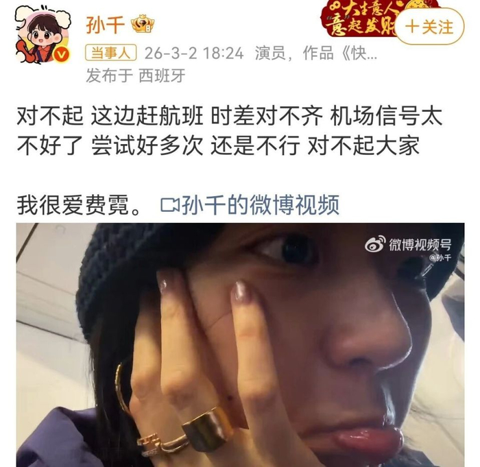 3月2日,《纯真年代的爱情》主演团队剧宣直播上出了个小插曲,孙千在西班牙机场连线直播,结果因为信号太差、时差又没对上,直播频频断连,最后实在没办法,只能被迫中断。这事一出,不少网友还没来得及吐槽,孙千就先主动道歉了,而同剧的郭晓婷,直接用一波暖心操作,把全网都暖到了。