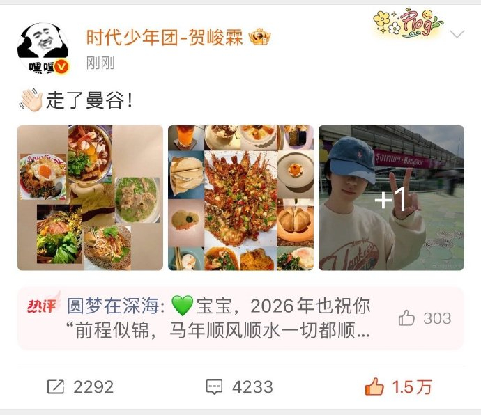 贺峻霖在结束曼谷家庭旅行后,于2026年3月1日通过微博发布行程收官动态“走了曼谷!”,并配以曼谷地标照片。同日,他在评论区明确预告:“明天我将发布我拍了这么多抖音当中最喜欢的一条,纯个人剪辑,大家可以期待一下!”。由此确认,旅行视频于3月2日正式上线。