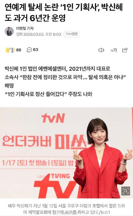 工商登记显示工作室持续运营至2021年:公开记录显示,朴信惠直至2021年3月仍担任该工作室的法人代表,且工作室迟至2026年1月19日(车银优逃税案发酵后)才完成韩国《大众文化艺术产业发展法》要求的文化企业登记。