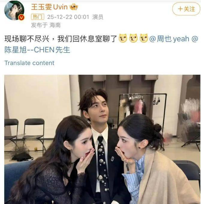 随着这个话题越来越热,王玉雯在微博上发了条动态回应:“现场聊得不尽兴,我们回休息室继续聊了”,还分享了三人在后台的合照。