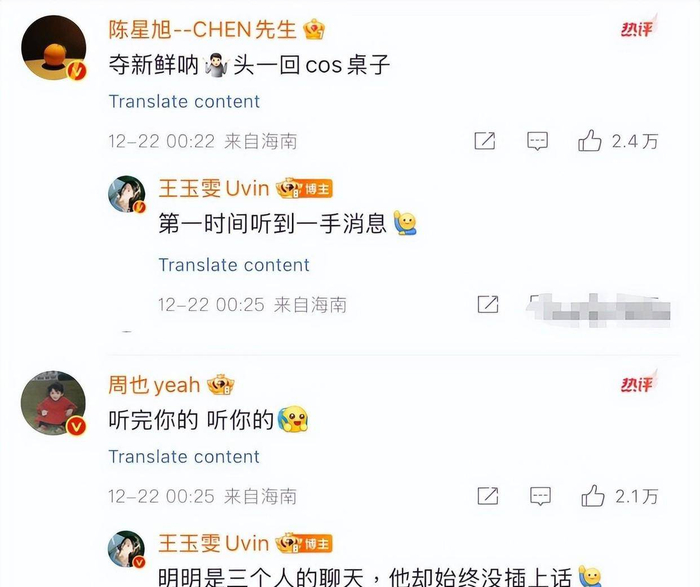 照片里还是王玉雯和周也在热聊,陈星旭则夹在中间,他自己调侃着:“夺新鲜呐头一回cos桌子”。