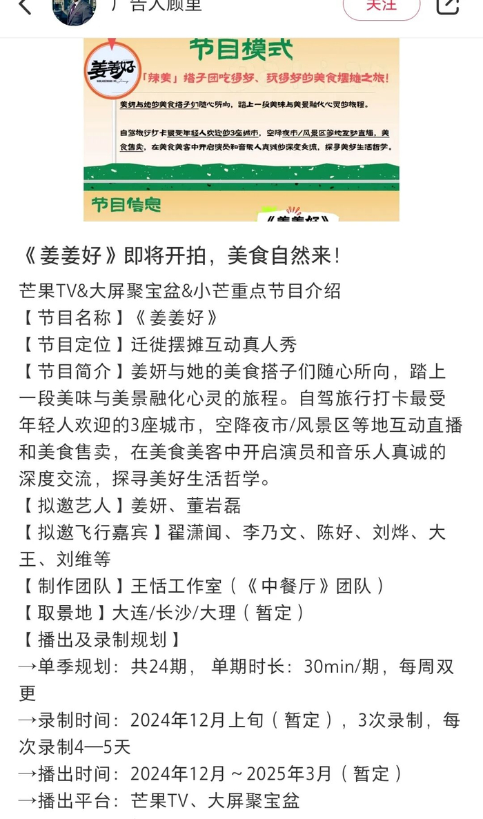 比如姜妍之前在成都录制一档,即将在2025年播出的综艺节目,叫做《姜姜好》。