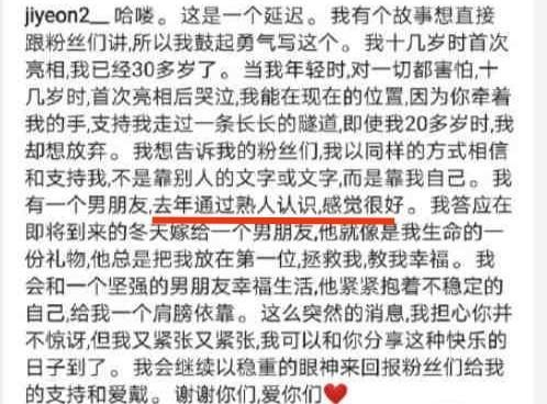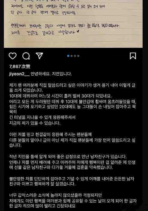 2月10日,韩国女星朴智妍在社交平台发布手写信,官宣与男朋友结婚。